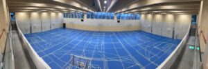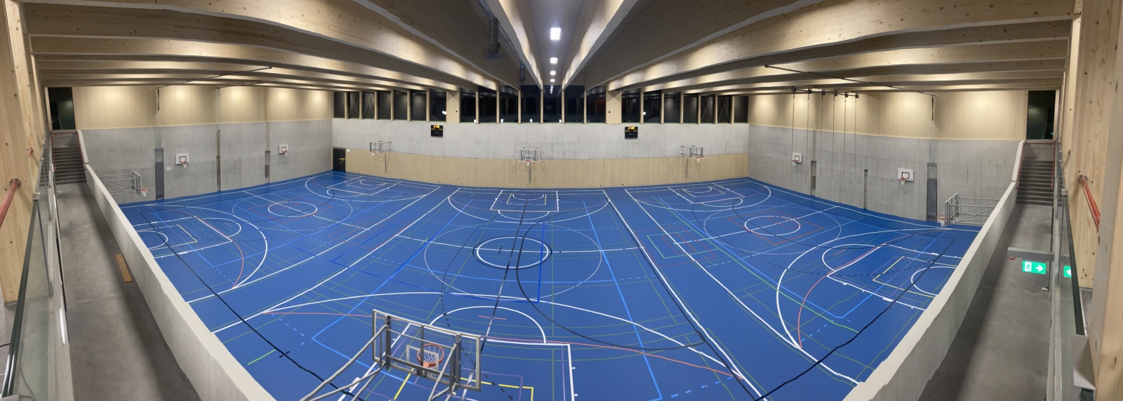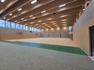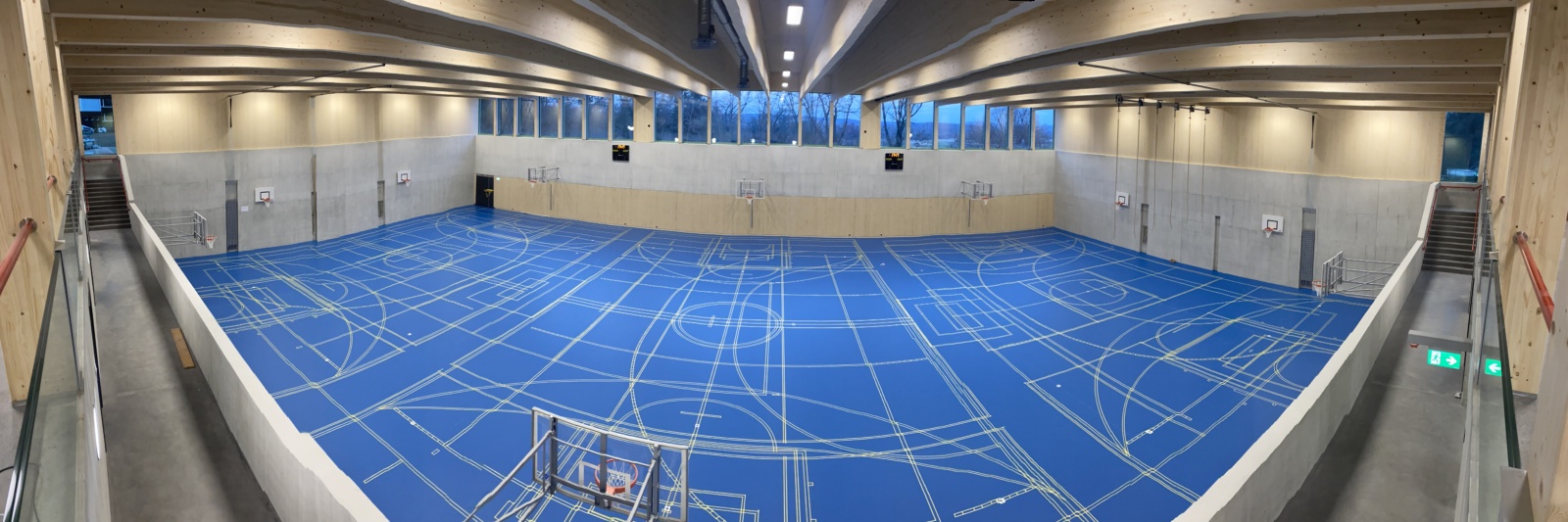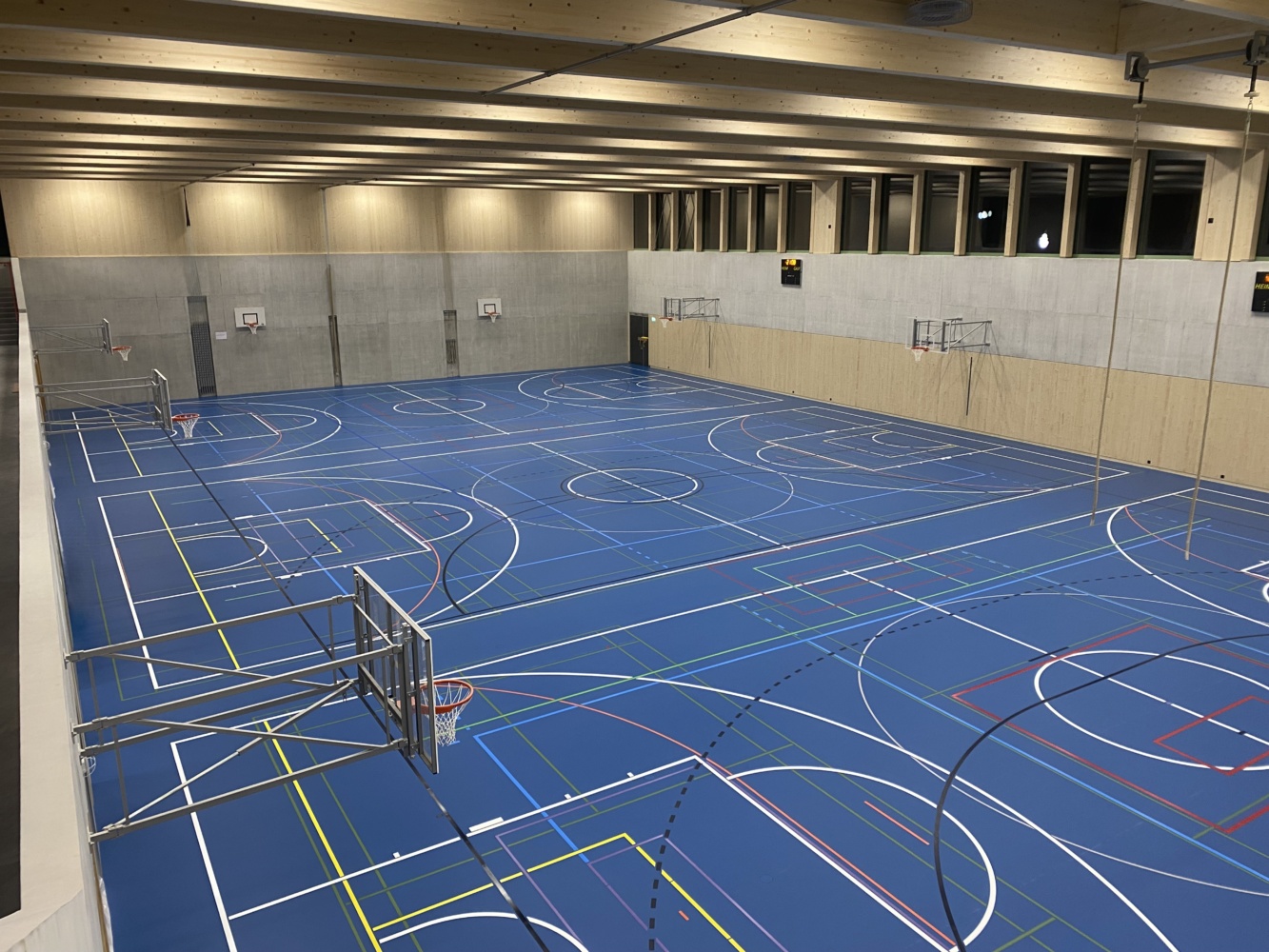 “Alles auch einer Hand” Einbau eines Neuen kombielastischen Sportbelag, ist eine spezielle Art von Sportboden, die zwei Eigenschaften kombiniert: flächenelastisch (gibt großflächig nach) und punktelastisch (gibt lokal unter Belastung nach). Dadurch entsteht ein besonders ausgewogenes Verhalten für verschiedene Sportarten.